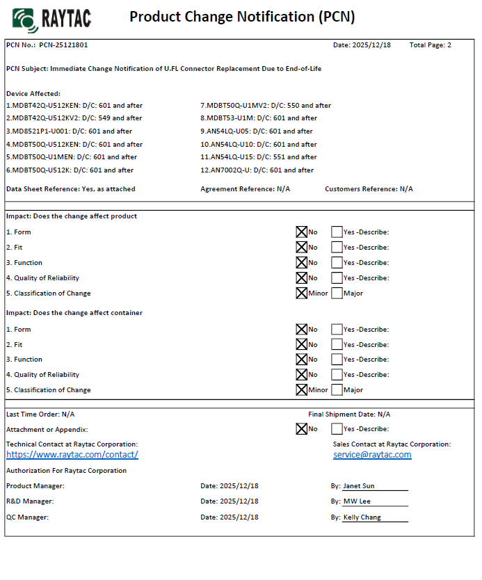 Raytac would like to announce an immediate Product Change Notice (PCN-25121801) for below modules, change effective on the Date Codes stated within.